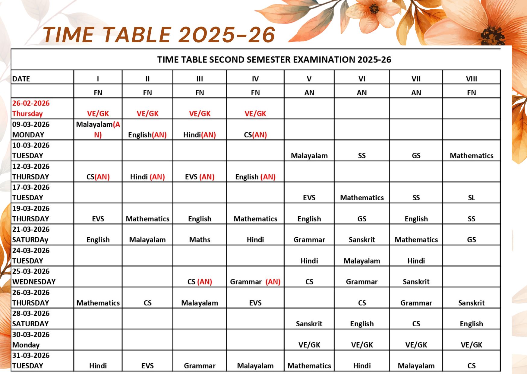 TIME TABLE FOR THE TERM EXAMINATION 2025- 26 FOR STD I-VIII