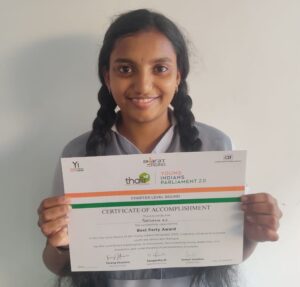 Parthana A.S. received the Best Party Award at the Young Indians Parliament 2.0